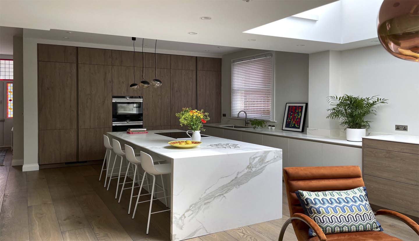 Projenin nüanslarını gözden geçirerek modern yaşam alanını yeniden tanımlamaya başladık. Arkadaki bir uzantı, mülkün düzenini yeniden tanımlayarak dışarıyı içeriye taşıyor. Geniş bir teras, mimari taş işçiliği ve çağdaş çevre düzenlemesiyle süslenmiş şık bahçeye kusursuz bir şekilde geçiş yapıyordu.